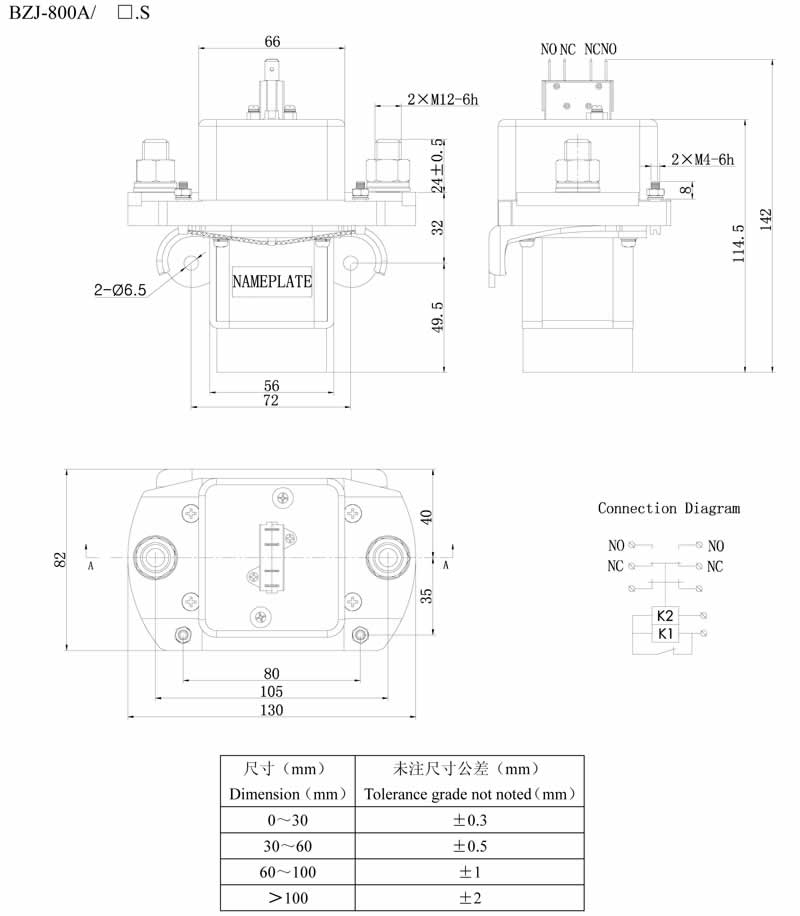 Example: BZJ-800A/48; said: Normally closed DC Contactor, 800A for DC-1 load rated current, coil voltage 48V DC.